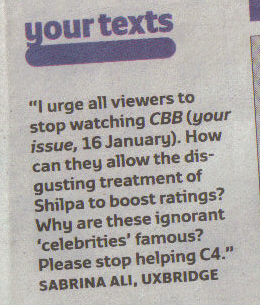 Well it was on Friday. This has actually been the worst time of my life. I am exhausted. My dad is taking a long time to recover from his heart bypass, and it is the most painful thing to see. For the first week, I took my mind off it by getting really emotionally involved in the Celebrity Big Brother saga. So much so, my letter actually got printed in thelondonpaper and the Metro! So I was happy but sad because my dad was back in intensive care that day.