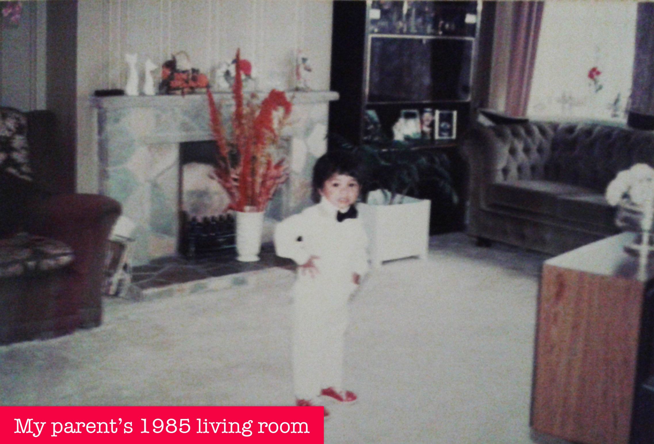 Velvet settees, crazy paving fireplaces, giant wooden televisions – remind you of a certain era? I remember the 1980s with fond nostalgia, the happy times when I would play for hours with my Barbie doll. And my little brother would lounge about in his white suit. Here is that living room from that happy time (didn’t my parents have good taste ;-))