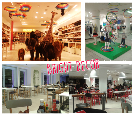 Inside we headed to the top floor for the children’s department and the lovely cafe. The displays were so bright and colourful, really standing out against the white walls. Umbrellas on the ceiling was an interesting concept.