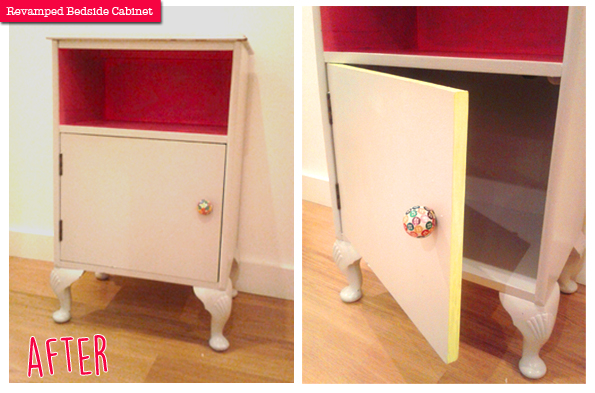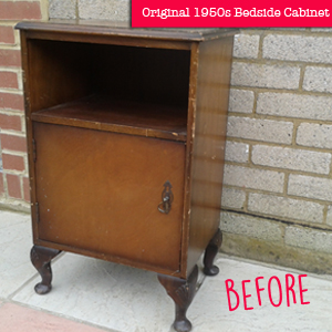 Here is another one of my parent’s neighbour’s treasures that my mum was going to give to the charity shop. But I recognised the feet – this was an authentic bedside cabinet from the 1950s! ‘STOP MUM!’ I said. I made her keep it in the garage until I was ready to give it a makeover.