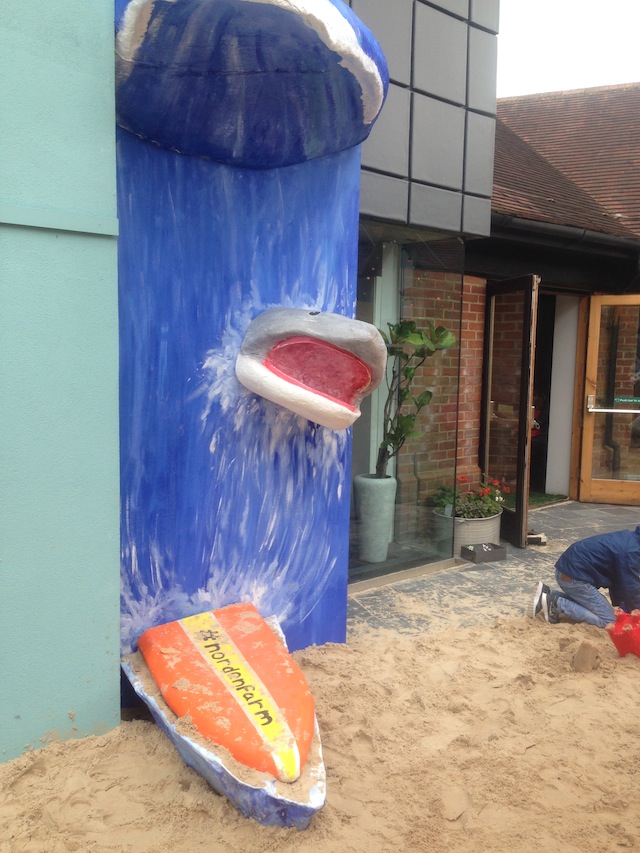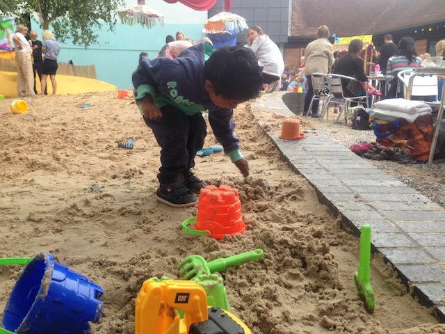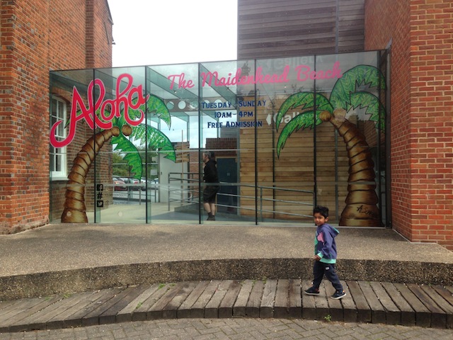 Last night I said to Tyler,  “Tomorrow when you wake up, we’re going to the beach!” “YES Beach!” He hadn’t forgotten in the morning, getting his buckets and spades and digger trucks ready. We set off to the Berkshire town of Maidenhead, me wearing my Hawaiian Lei to get in the mood. It’s roughly a 10/15 minute drive from Slough. Today was the launch of the Maidenhead Beach at Norden Farm, which is on Altwood Road – quite freakily off the road where I used to work at Mattel 7 years ago. Now that journey was a trip down memory lane!