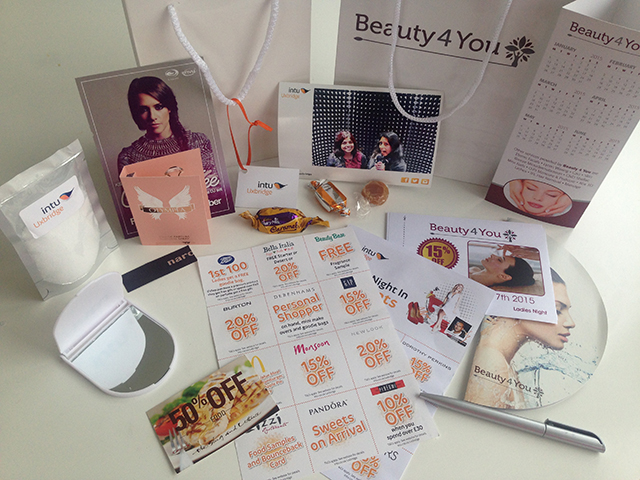 We also saw ladies getting hair makeovers, and there was a selfie stand with props. We got handed a Beauty4You goody bag too. Apparently Calum Best was in Waterstone, but we didn’t see him. All in all, it was a really enjoyable night. There’s a really different atmosphere shopping at night with just us ladies there, like we had the place to ourselves and we were made to feel very special. Plus the amount of freebies! Here’s what was in our goody bags – bath salts, a mirror, pen, sweets, vouchers and a calendar. If you see an evening event coming up at your local intu shopping centre, book a ticket! It is so worth it!