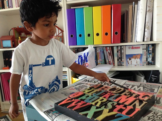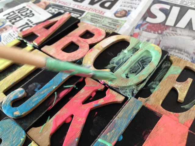With the alphabet piece, I started roughly painting the letters in different colours and then Tyler took over.