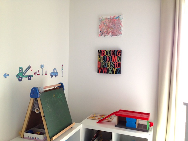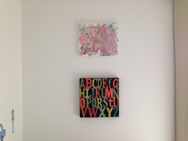 I hung the pieces up in Tyler’s bedroom and I LOVE it! It’s art on the wall actually made by Tyler 🙂