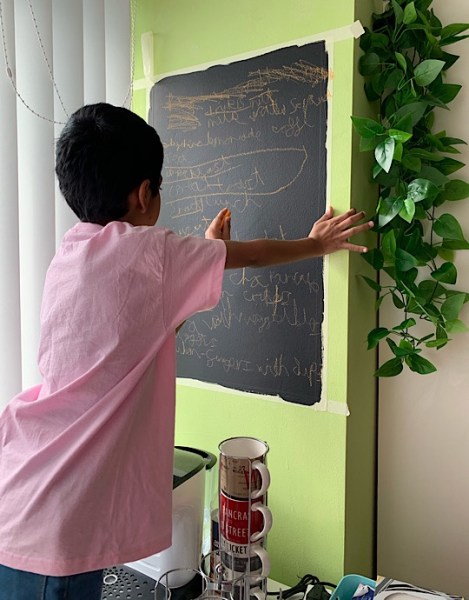 One Sunday we decided to finally paint our ‘Flamingo’s Amazing Costa’ corner. The kids did the green. I added the chalkboard in the night. The next morning Tyler was already writing on it before I had woke up – the masking tape was still on then.