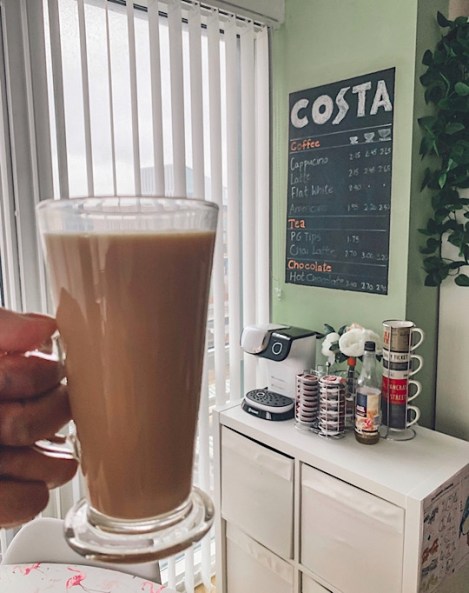 This is a photo of the Costa coffee shop I have made for us – this menu I created with chalk pens makes it feel like the real thing. I love sitting here with the blinds open, facing the sign, looking out of the window with my coffee pretending I’m really at Costa. It’s the little things.