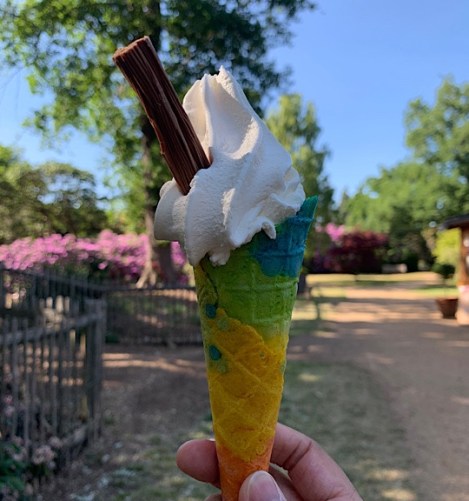 There are walking trails you can do after you picnic. We chose to stay around Temple Garden, and then on the walk back to the car park, we got ice creams from the ice cream van. Social distancing measures were in place, with 2m markers on the floor to help with queuing. Look at this rainbow ice cream cone – ahhh! The car park costs £3.70 for 3 hours and although it looked full, the people were spaced out in the park and it was easy to social distance.