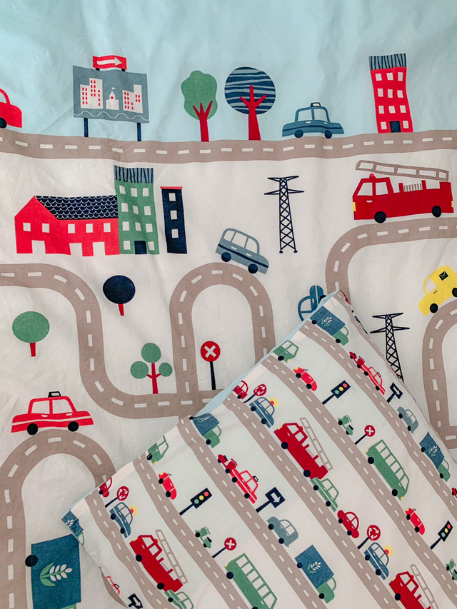 Tyler’s duvet set is called the “Auto City Theme“, which has the sweetest road map design, and a sky design at the top. Both the duvet and the pillowcase are double-sided, with the road design on the other side. Vertbaudet do three sizes as they are a French company, but for UK sizing choose 140 x 200 with 50 x 75 pillowcase.