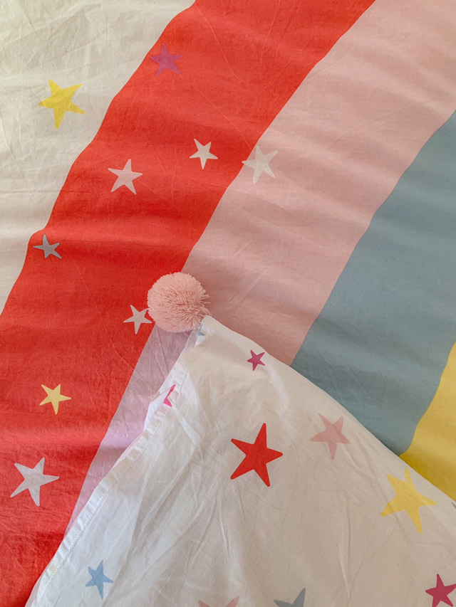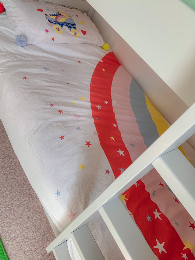 Lily’s duvet set is called “Roller Girl Theme” and it has a colourful pastel rainbow print as well as pom poms on the pillowcase! Lily chose this one because of the Trolls movie and the roller skating scene.