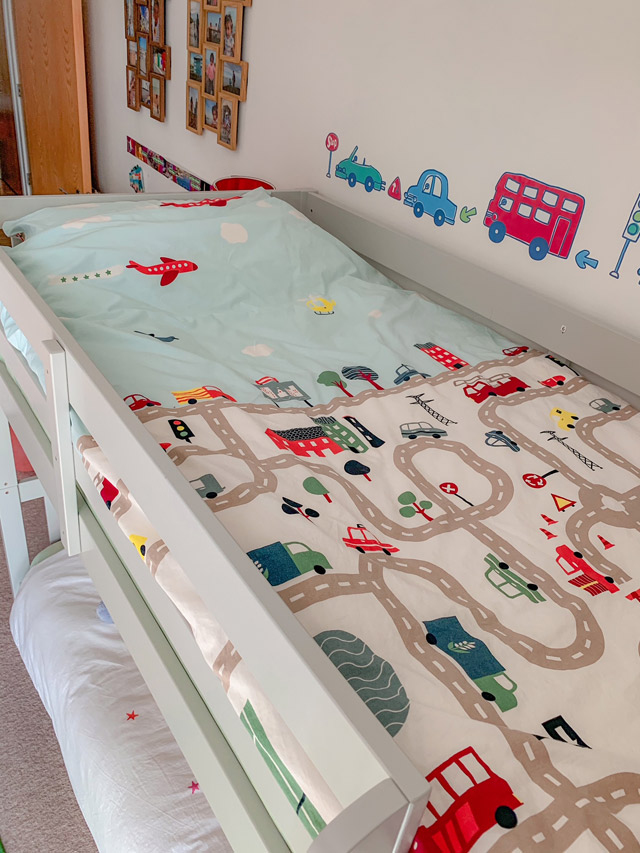 We had decided to choose duvet sets that suit the kids’ personalities, rather than matching ones. Tyler of course is all about transport, where Lily loves bright colours and rainbows.