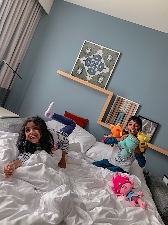 Just to explain, there are two hotels in the building. The Moxy is on floors 0-4 and that is the Thunderbirds themed one with rooms for up to 3 people. The Residence Inn is on floors 5-9 and those are apartment style, suitable for families.