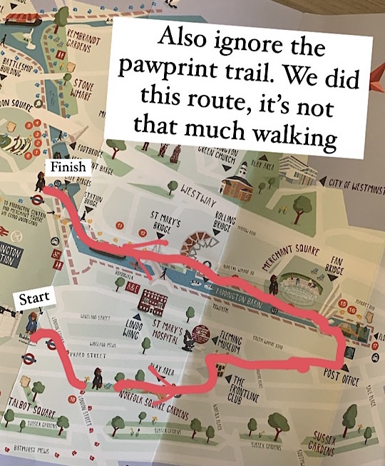 Did you know there’s a little Paddington Bear statue trail in London Paddington? It’s not a brand new one, I think it was first put up in 2018, but we’d never done it before. You can pick up “The Pawprint Trail” map from the Paddington Bear shop at London Paddington train station – just ask for it at the shop counter. The first statue is inside the shop.