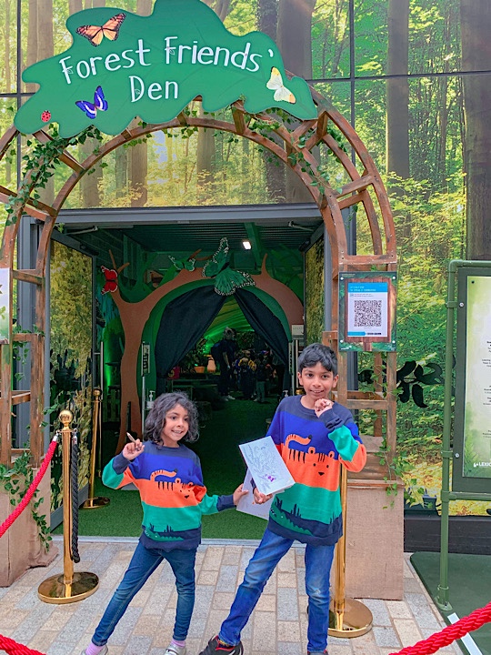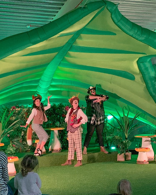 We went to a live storytelling show at the Forest Friends’ Den, where we stepped into a magical world to hear exciting tales from the forest and learn about the characterful creatures who live there. We were greeted by Swinley the Stag, who had a proper East End Cockney accent! She brought each family bubble in one by one to seat us personally.