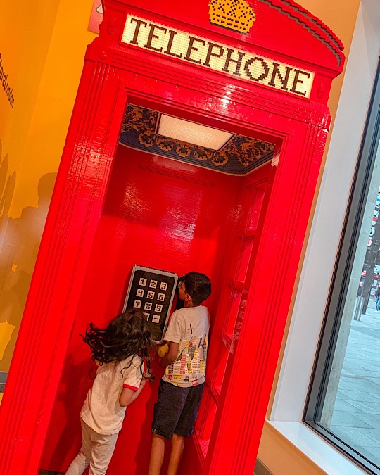 There’s a total London Underground theme. All made out of LEGO, you can see a tube carriage, Underground map, Mind the Gap platform into the lift, roundels, Big Ben, a red phone box, flower stall, postbox, an amazing huge London scene on the stairs up, a YouTube screen. And then there’s the characters and the dragon in the ceiling.