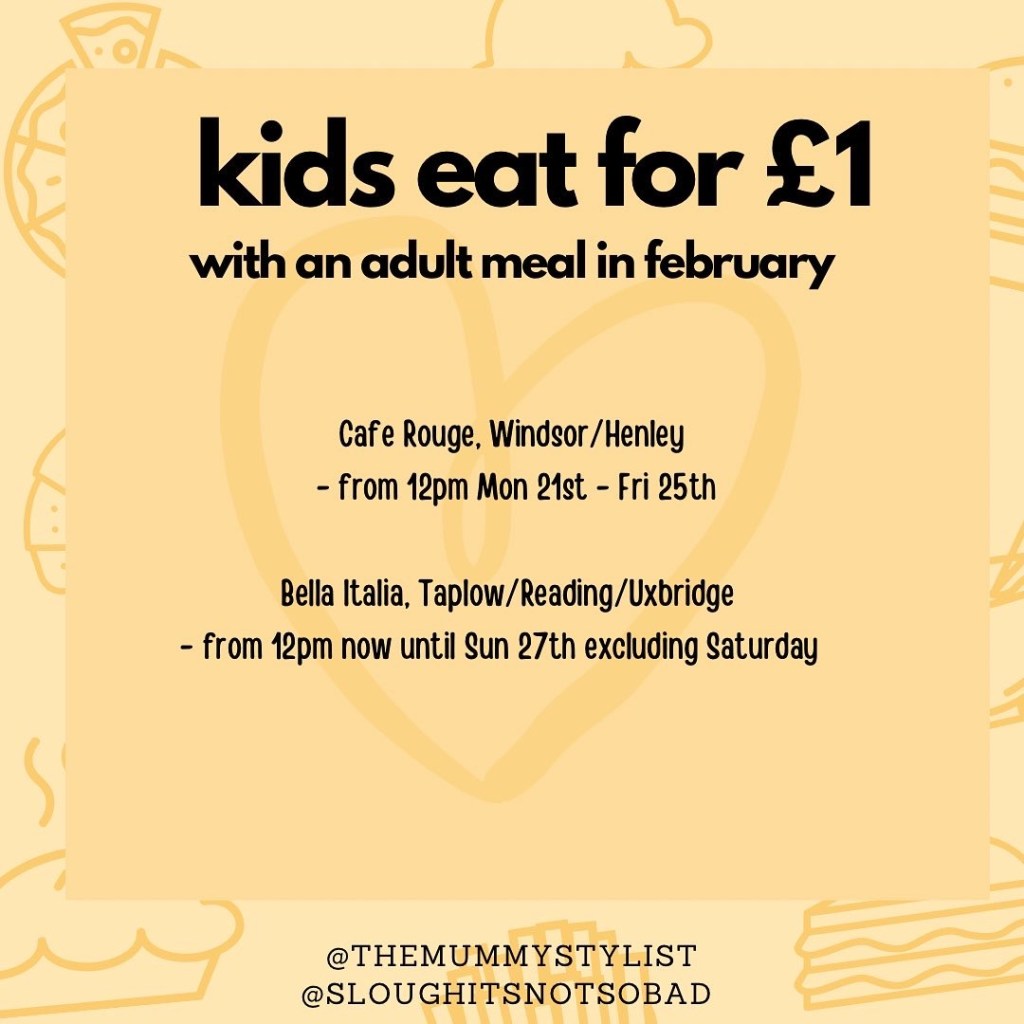 • Bella Italia – Taplow/Reading/Uxbridge: one child eats for £1 per adult from 12pm now until Sun 27th excluding Saturday. You have to put your email address in online to get the offer code