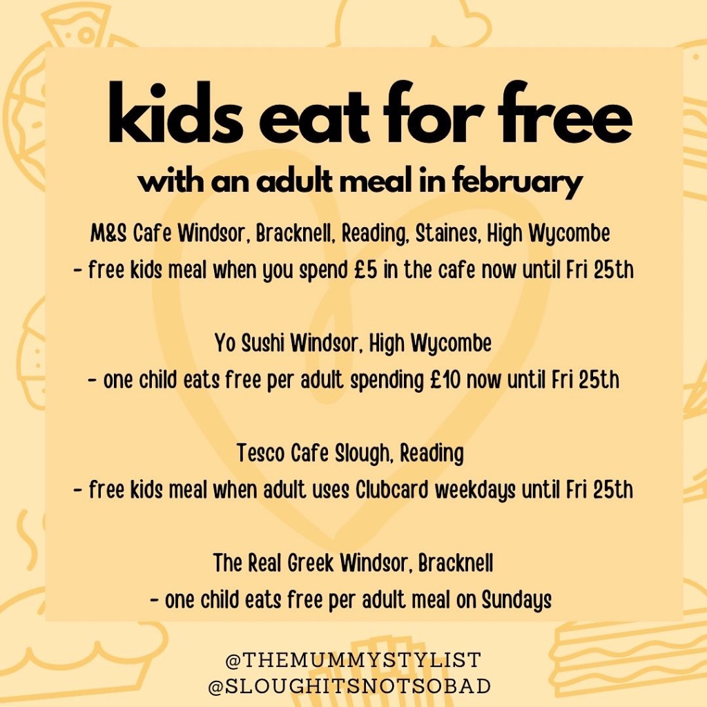 • M&S Cafe – Windsor, Bracknell, Reading, Staines, High Wycombe: free kids meal when you spend £5 in the cafe now until Fri 25th